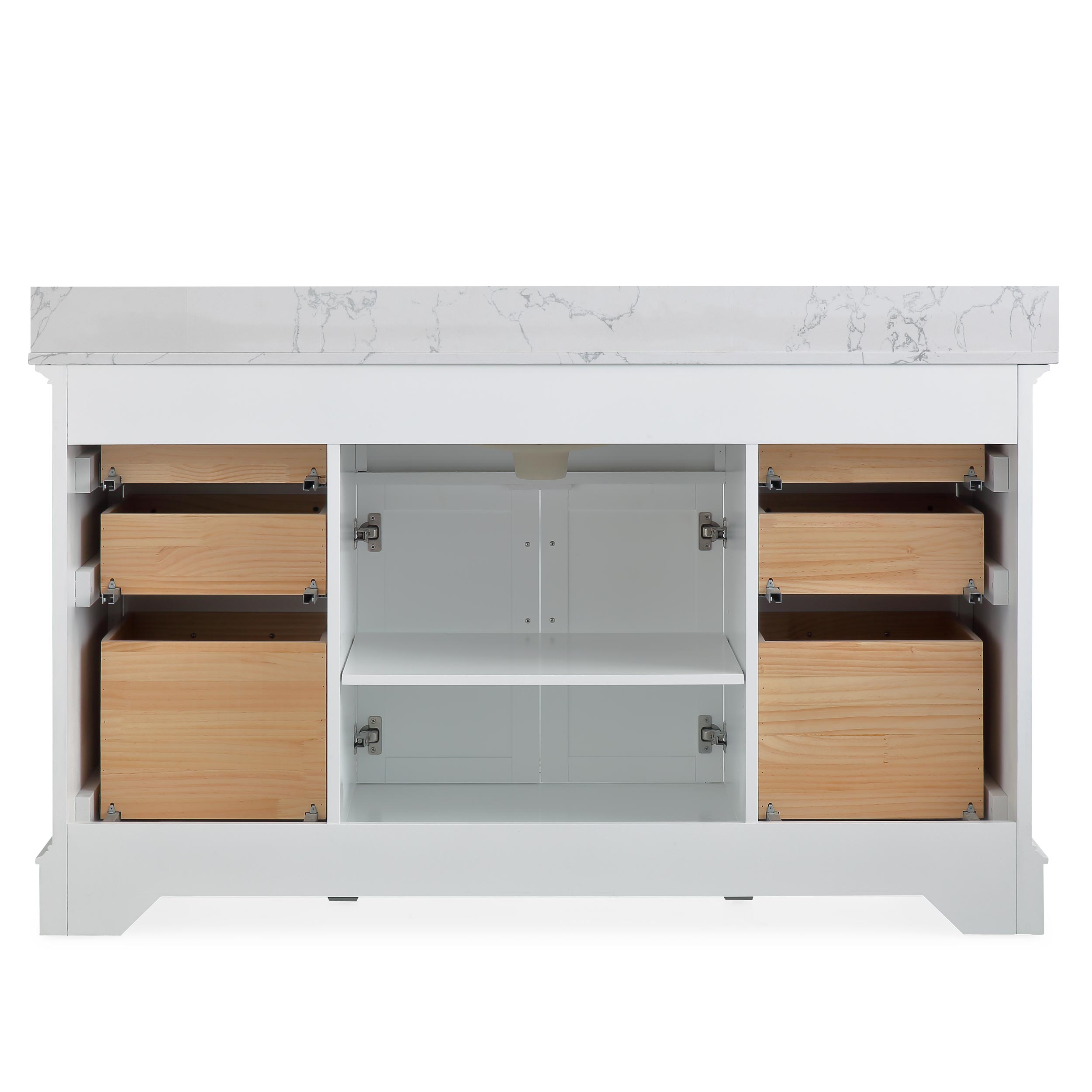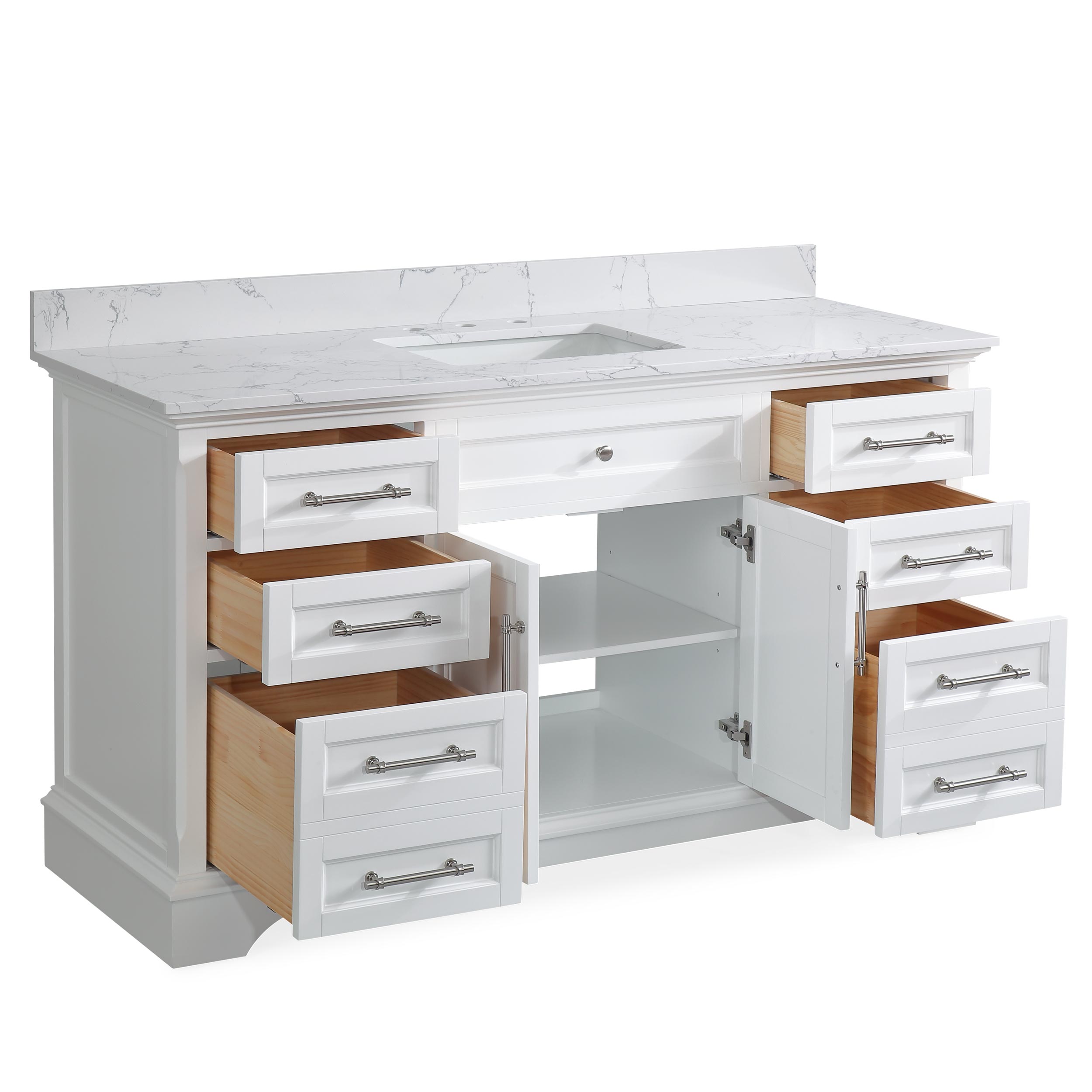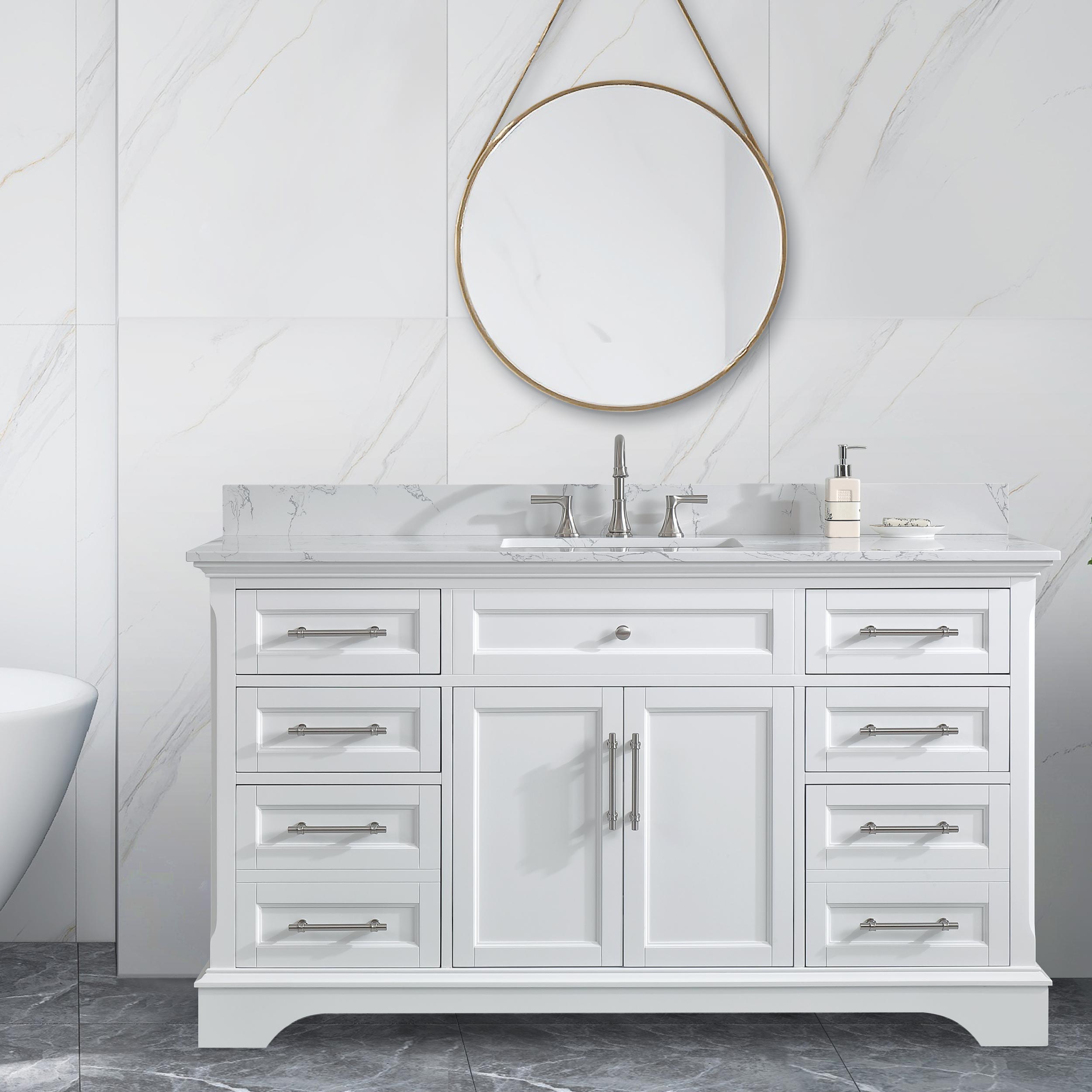 60" White Single Sink Bathroom Vanity Calacatta White Cultured Marble Top Cabine