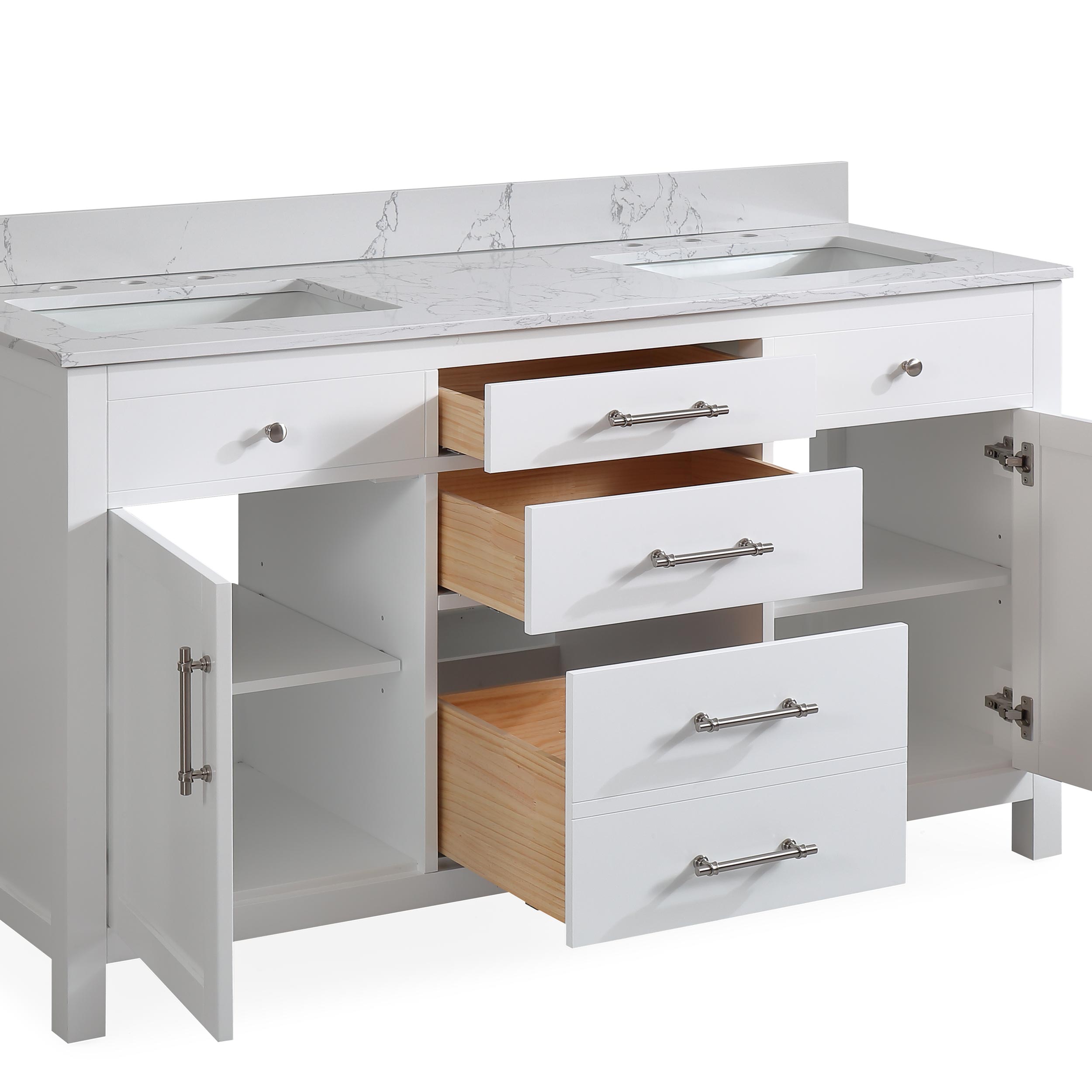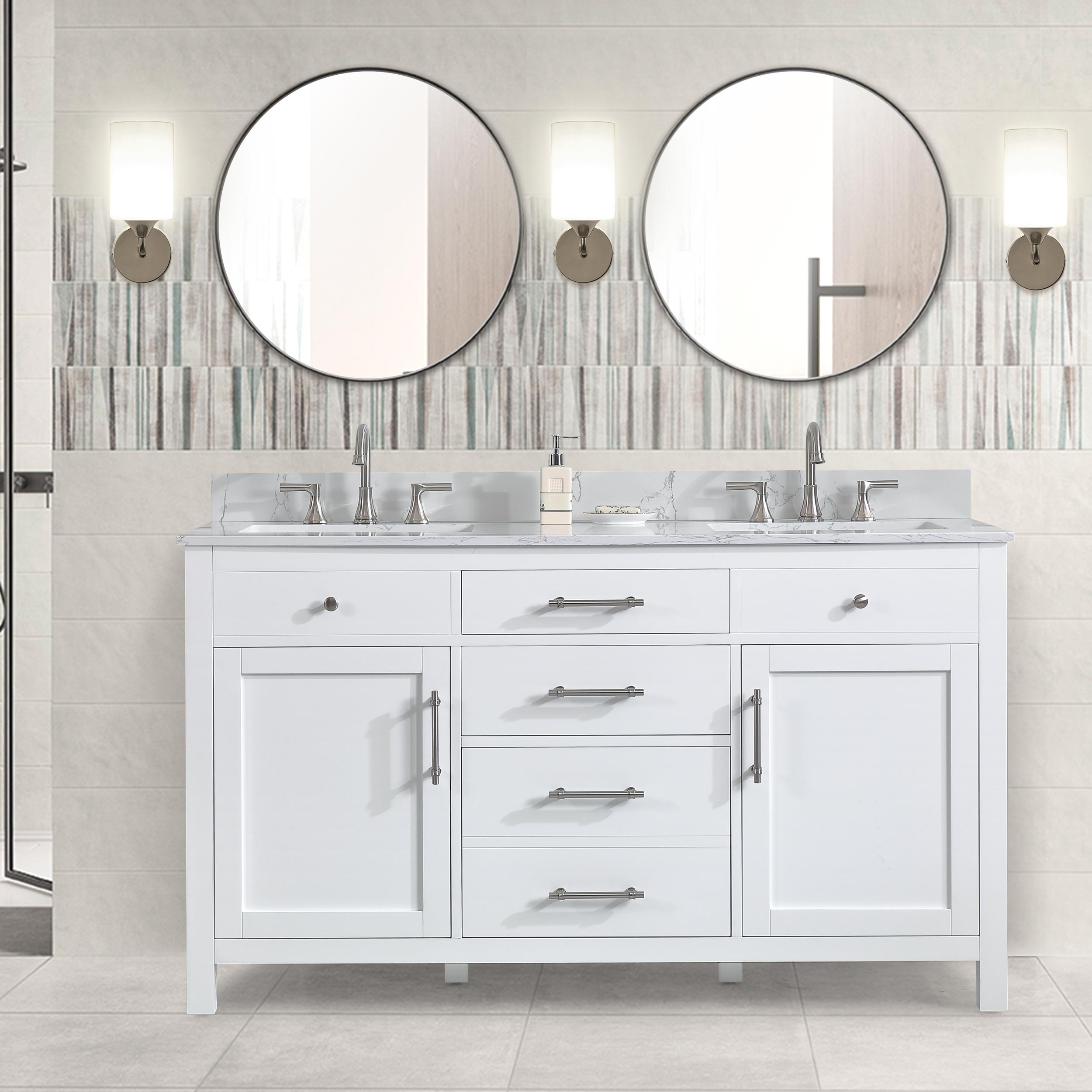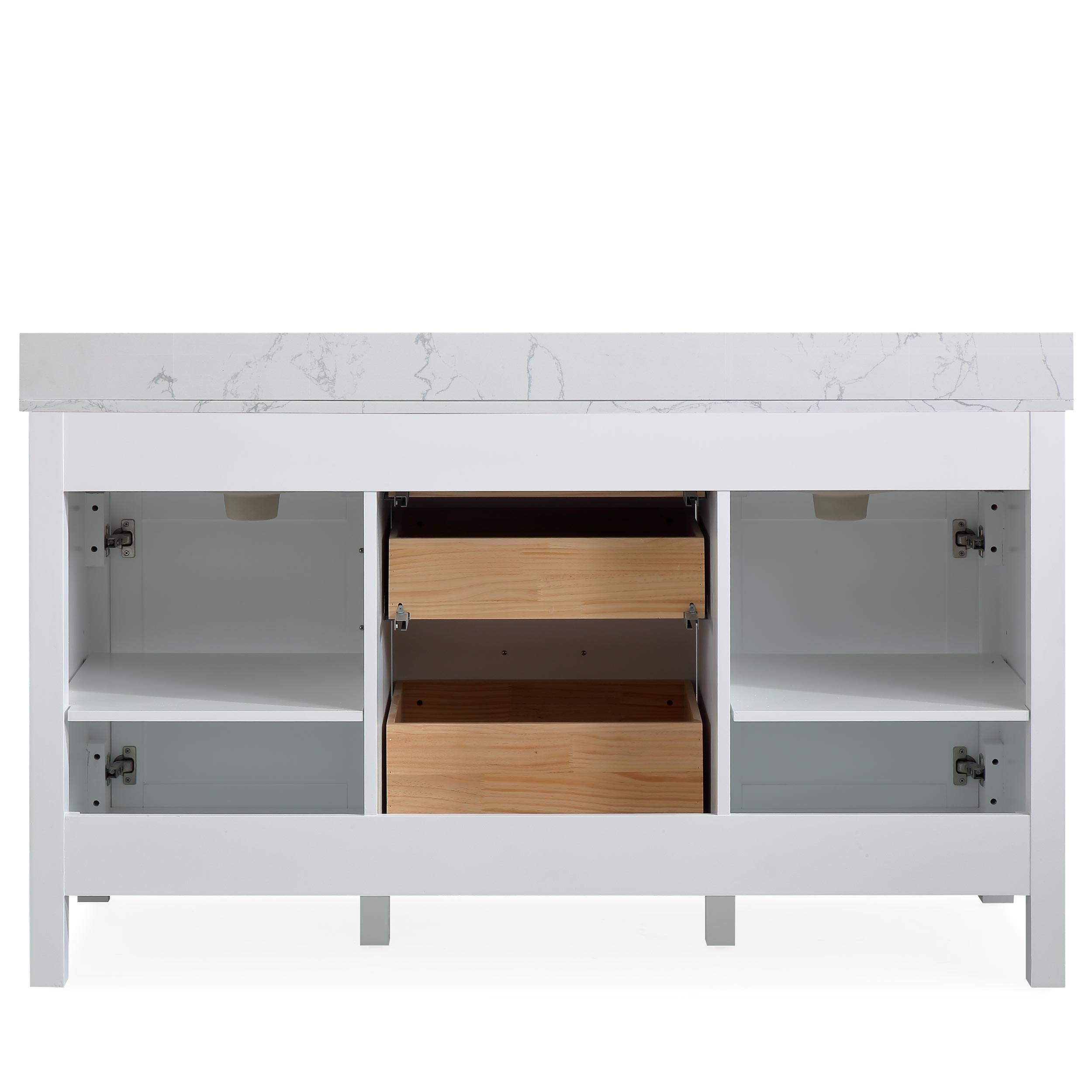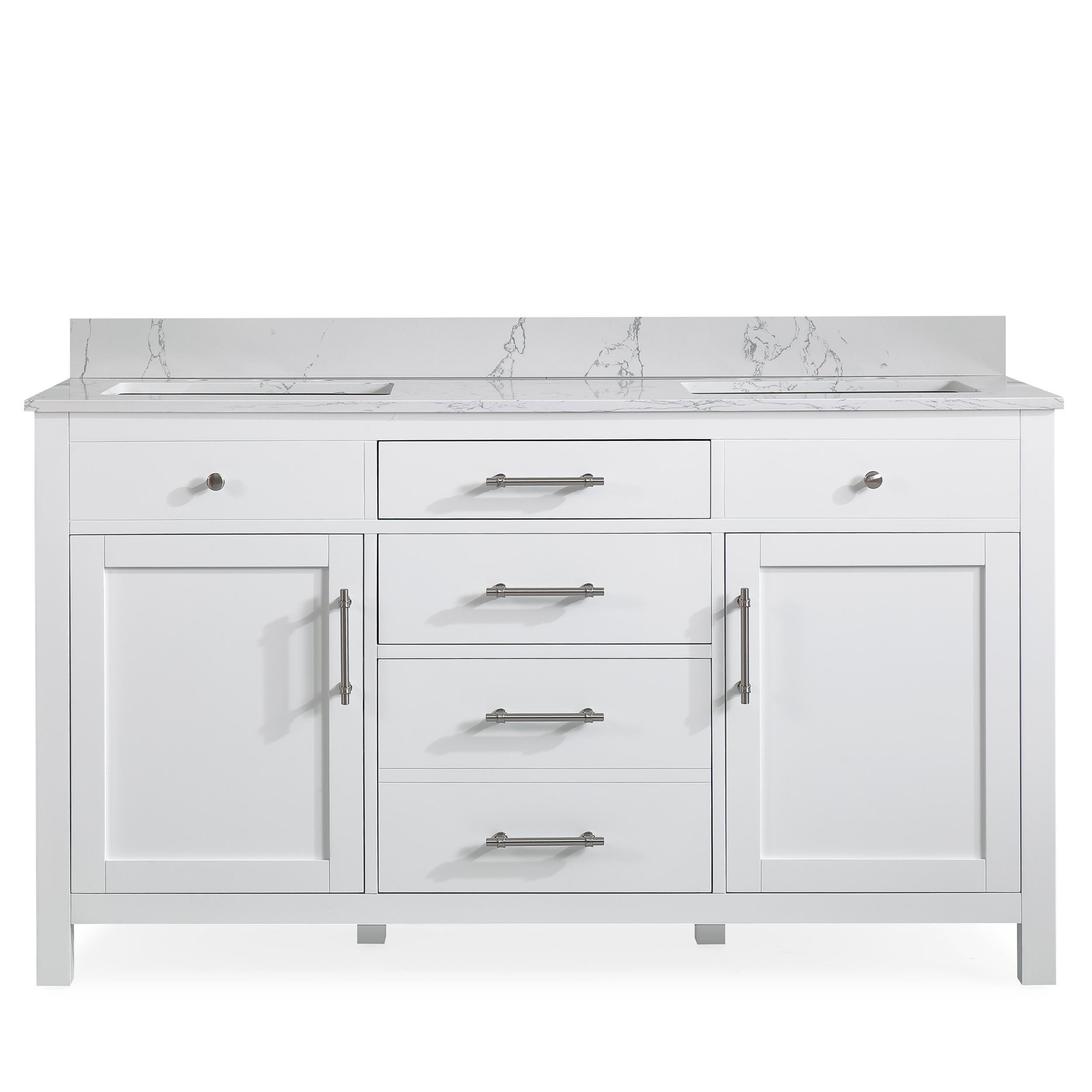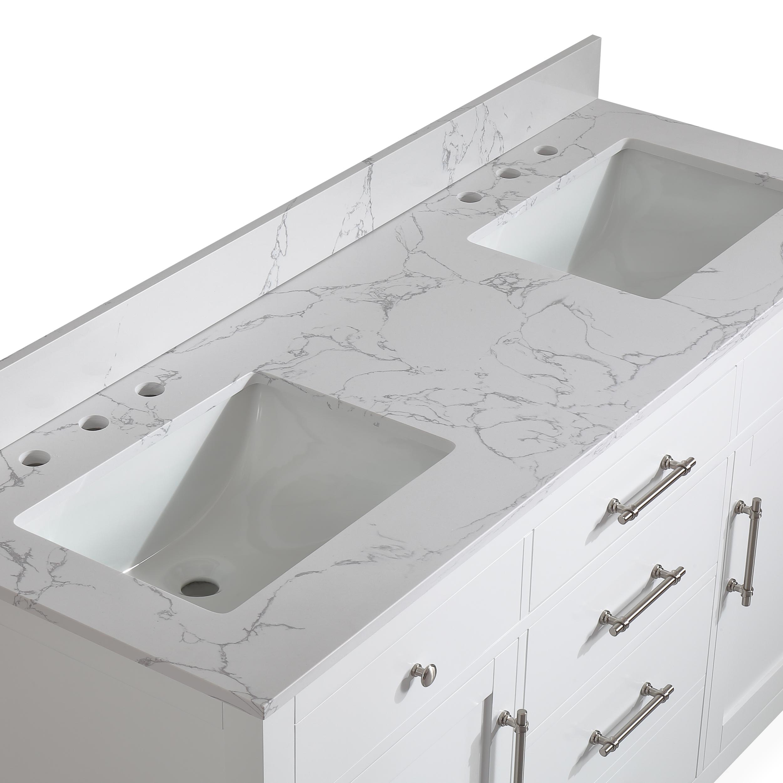60" White Double Sink Bathroom Vanity Calacatta White Cultured Marble Top Cabine