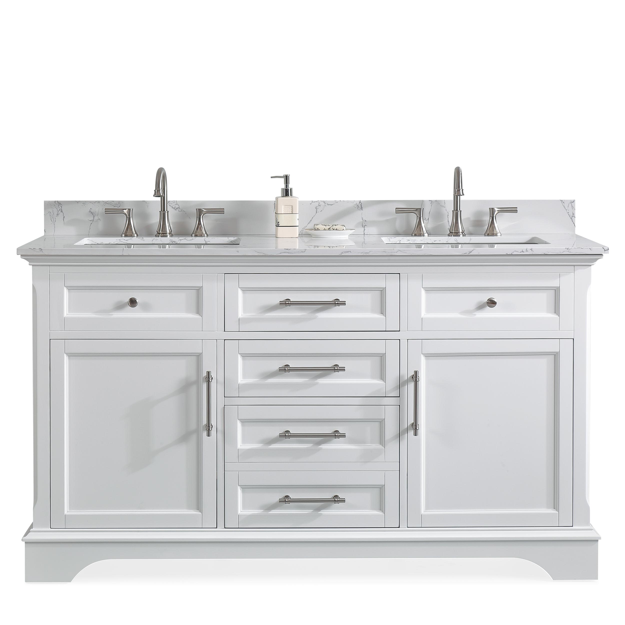 60" White Double Sink Bathroom Vanity Calacatta White Cultured Marble Top Cabine