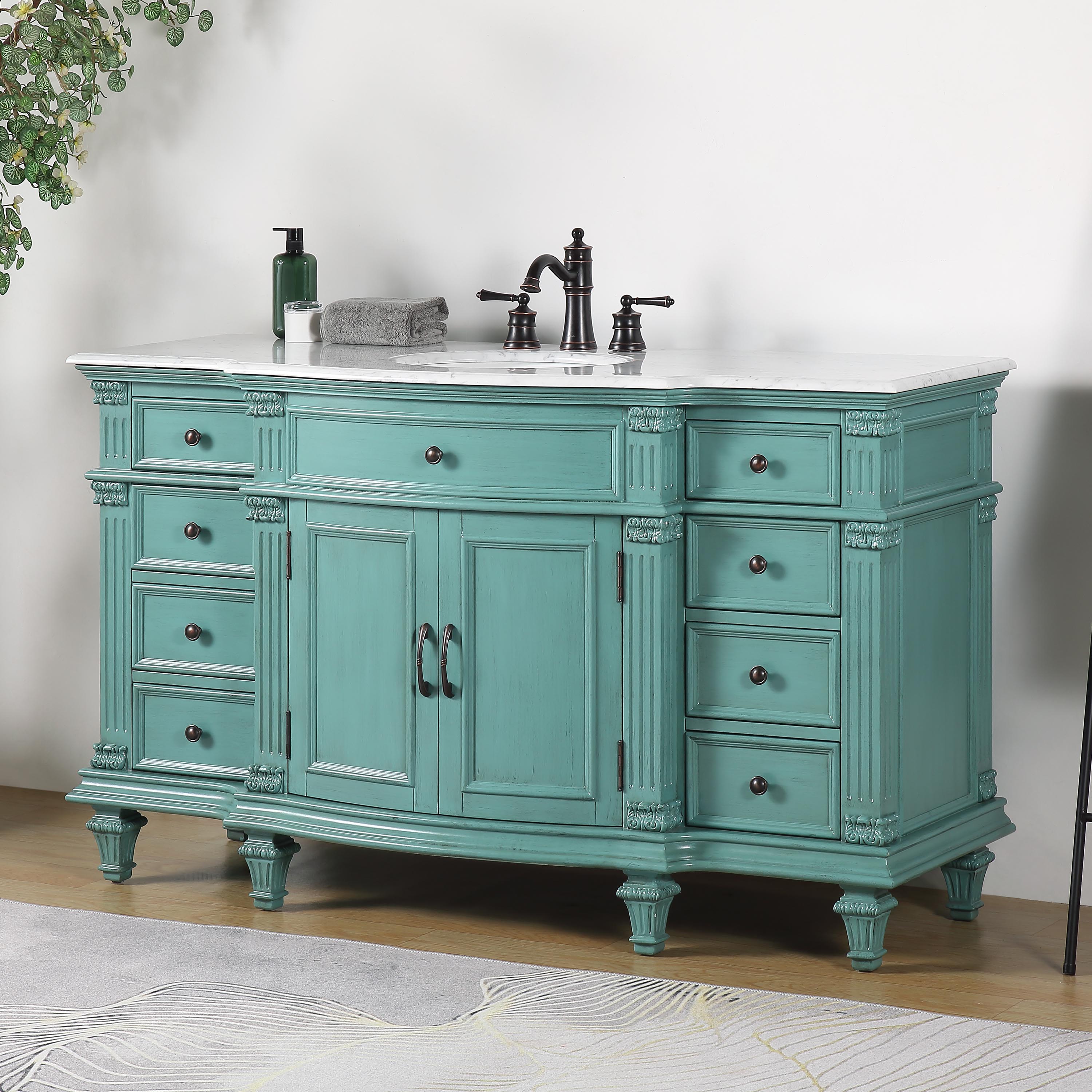 60" Single Sink Cabinet Carrara White Top Retro Green Bathroom Vanity